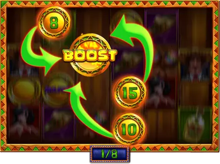 The boost symbol can appear on the 3rd or 4th reel. The boost symbol is available in the main game and in the free spins mode