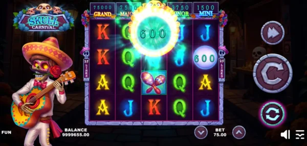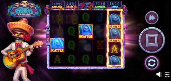 Entra nello Skull Carnival, una slot di Halloween ricca di simboli jolly, jackpot e vincite festive su 25 linee di pagamento.
