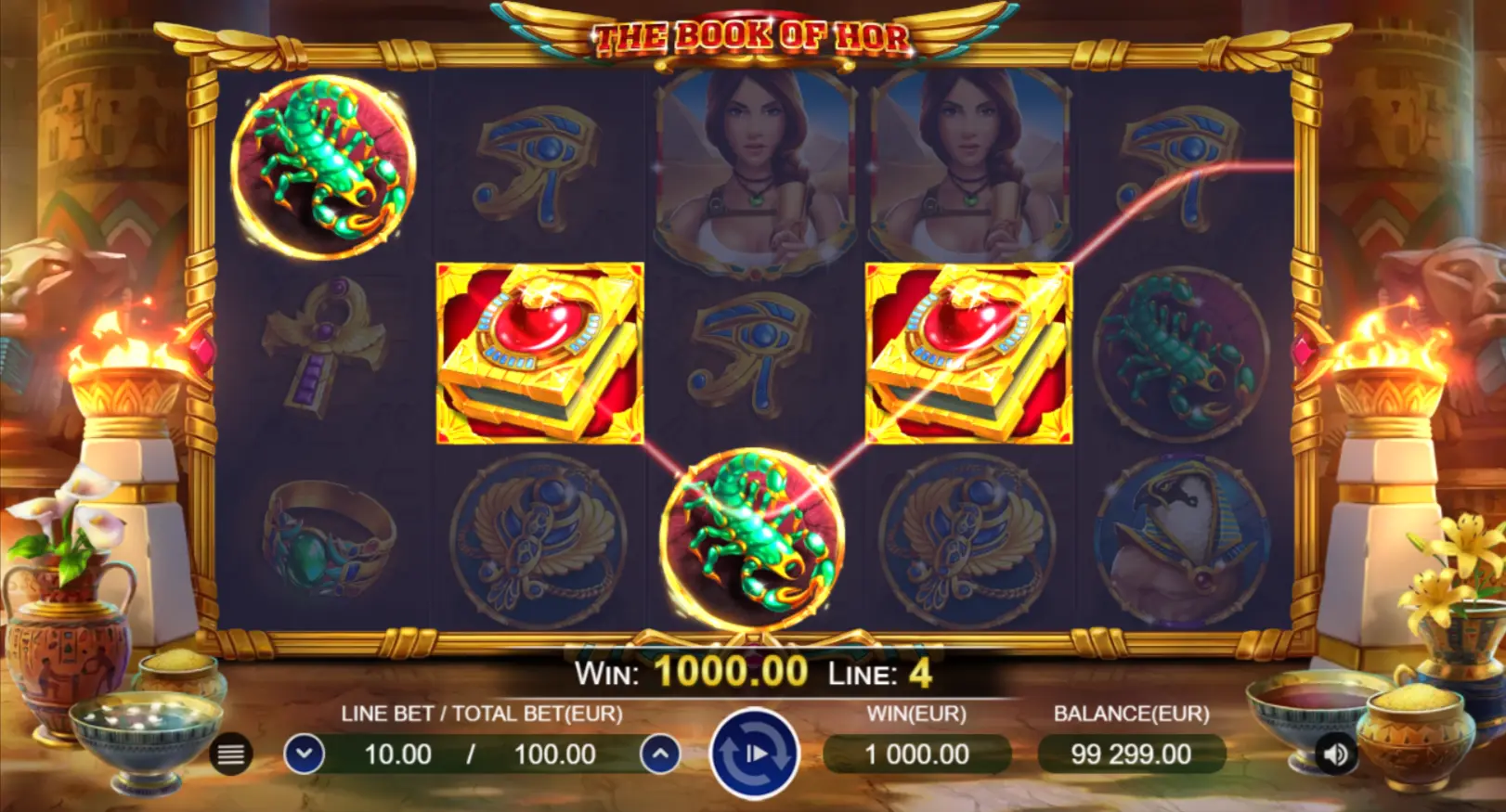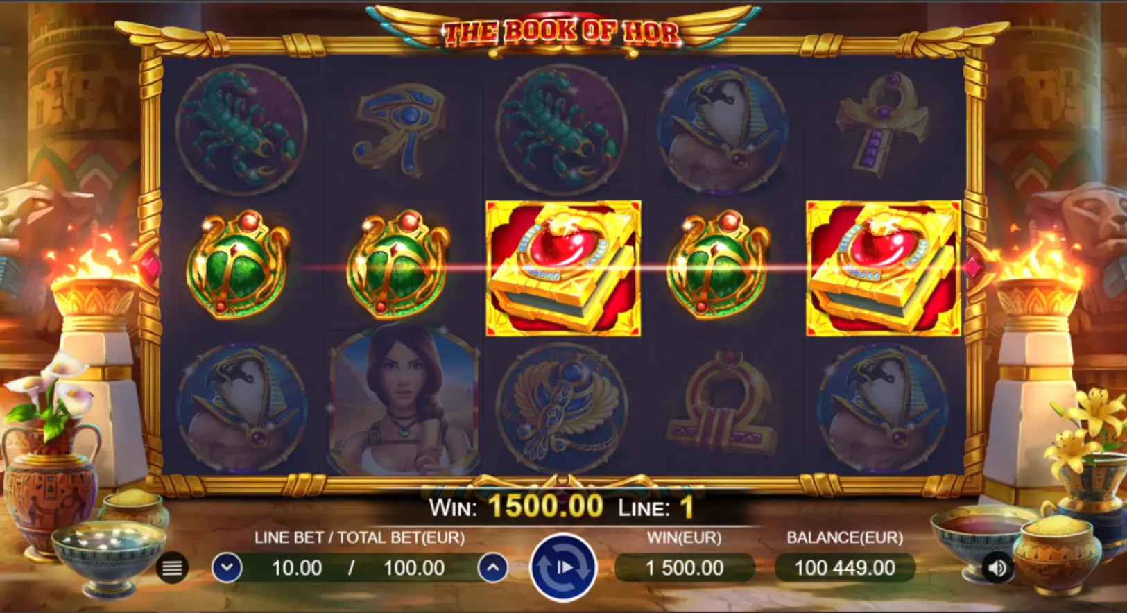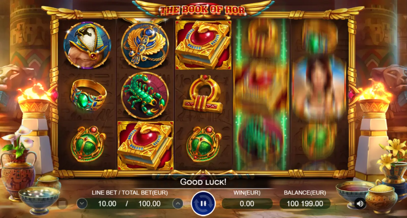 Mas o poder do grande livro não termina com a substituição de símbolos! Se você coletar três símbolos, o livro absorverá toda a luz do sol e mergulhará a Terra sob a posse do sombrio Anúbis. O deus chacal lhe concederá giros grátis, e o poder de um livro aberto fará com que um símbolo aleatório se expanda. Tenha tempo para extrair o máximo de ouro possível deste mundo sombrio antes que o sol brilhe novamente.