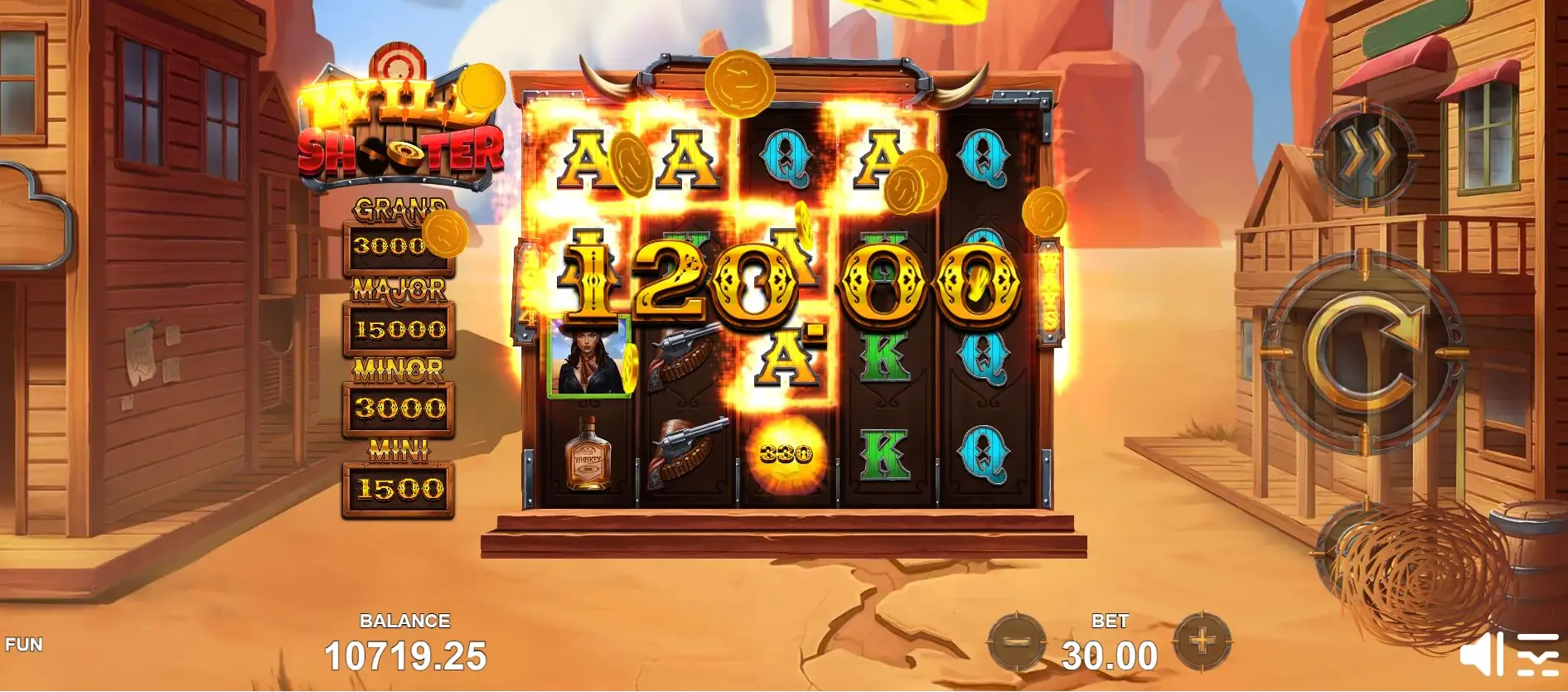 Atirador selvagem te leva ao coração do selvagem Oeste Selvagem, onde pistoleiros vagam e fortunas são feitas com o apertar de um gatilho! Prepare-se para uma aventura de alto risco por salões empoeirados, confrontos intensos e ouro escondido. Com wilds brilhantes, multiplicadores de procurados e giros grátis rápidos, cada giro traz a emoção de um duelo ao meio-dia. Pronto para sacar primeiro e reivindicar a recompensa? Entre neste caça-níquel cheio de adrenalina e prove sua pontaria em uma terra onde só os ousados ficam ricos!